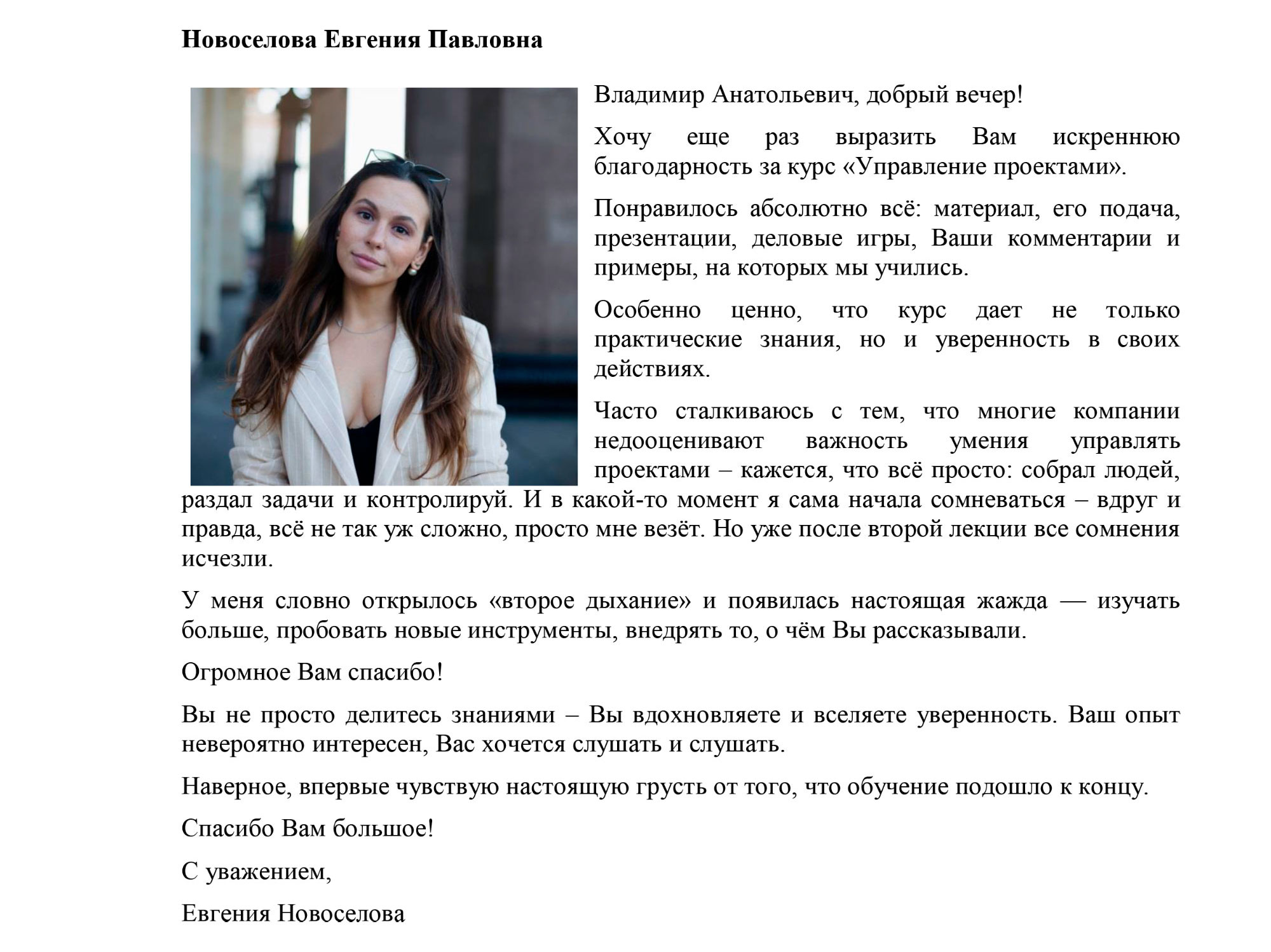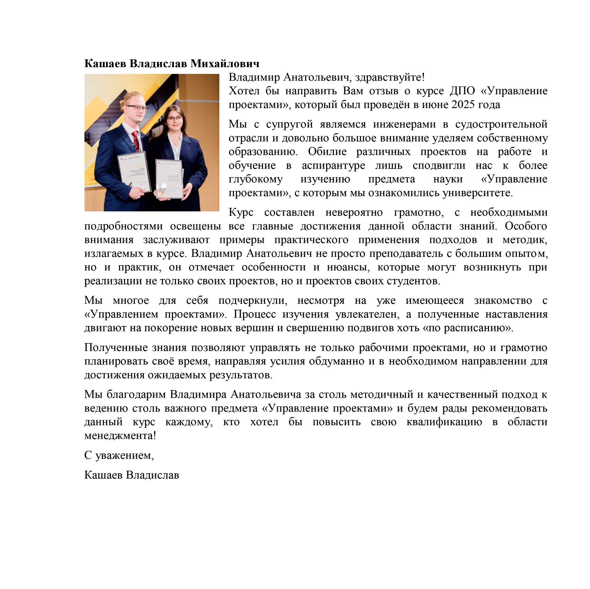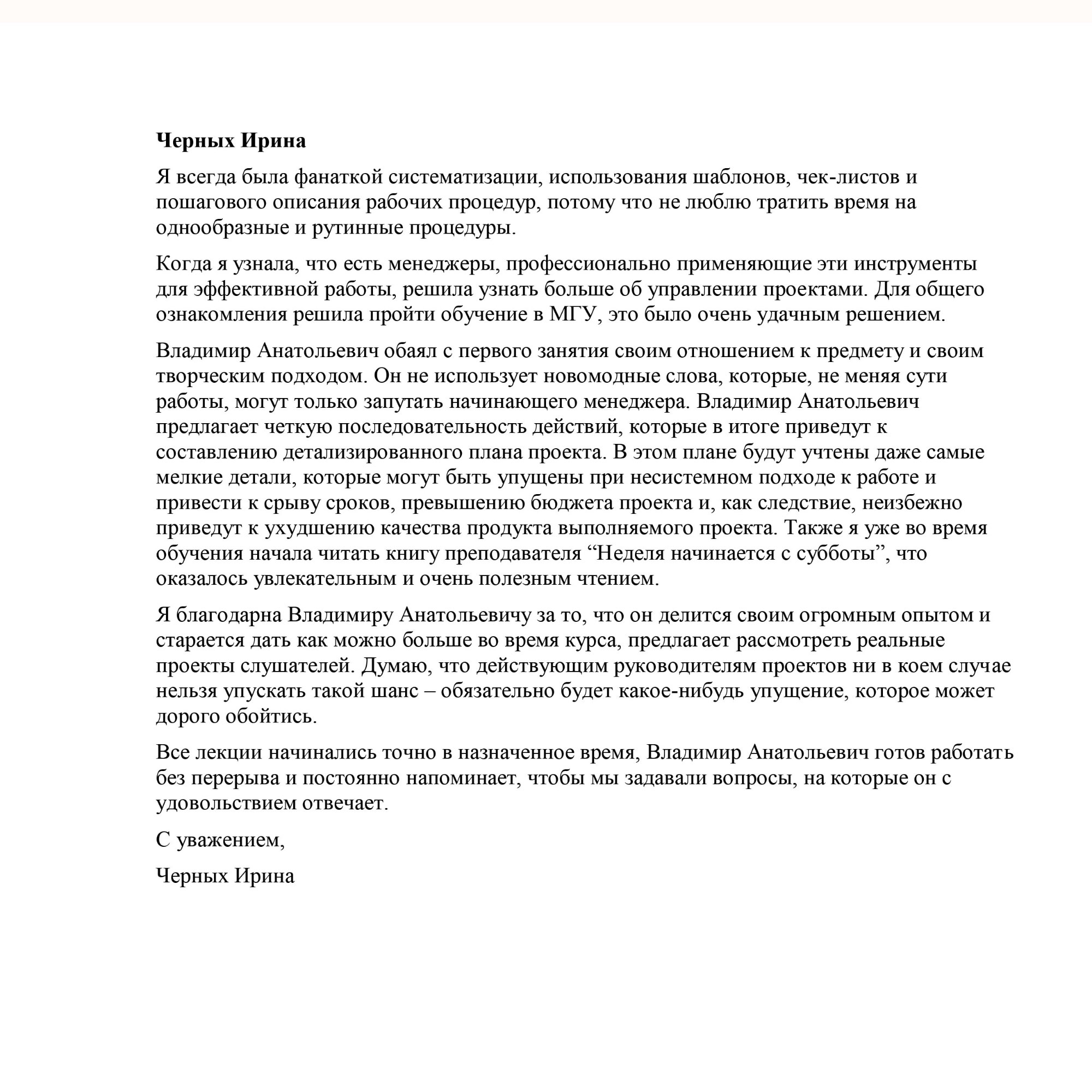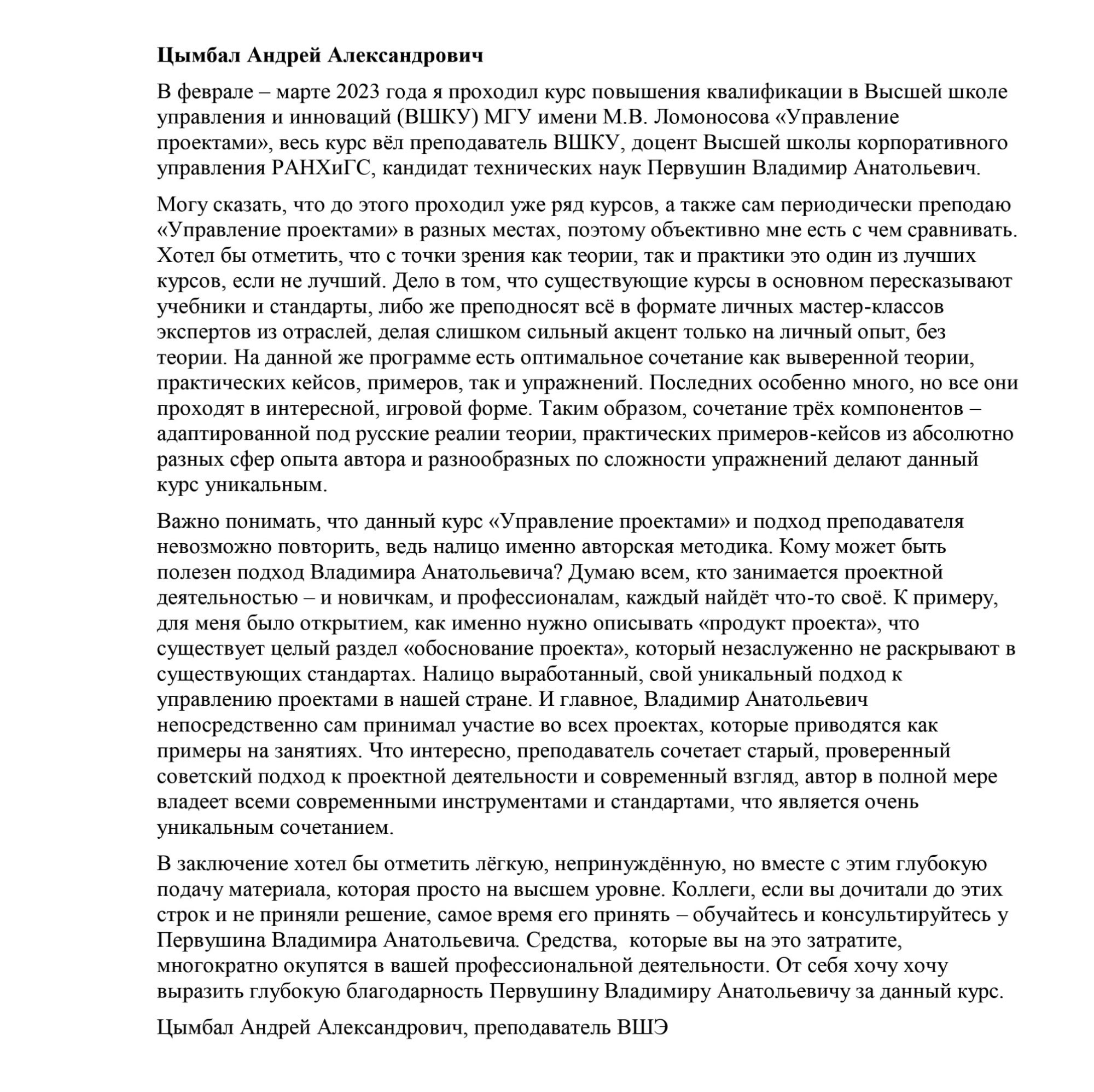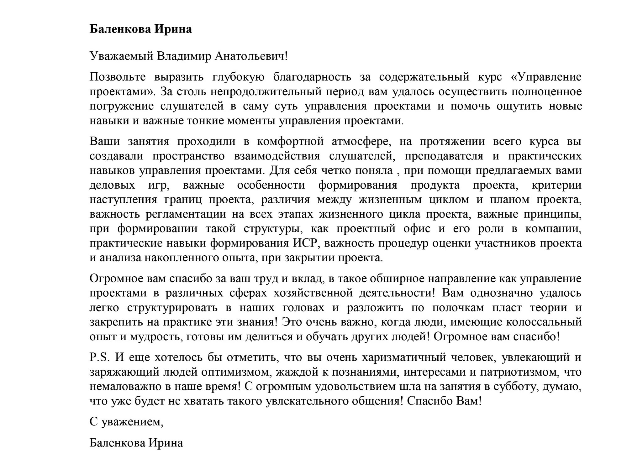 Уважаемый Владимир Анатольевич! Благодарю вас за лекции, проводимые вами в рамках курса "Управление проектами". Курс очень познавательный и структурирован так, чтобы можно было получить самые важные и необходимые знания. Особенно это касается Деловых игр, где можно рассмотреть и понять всю сложность структурирования, управления и реализации проектов. Спасибо вам большое за обучение и мои знания!