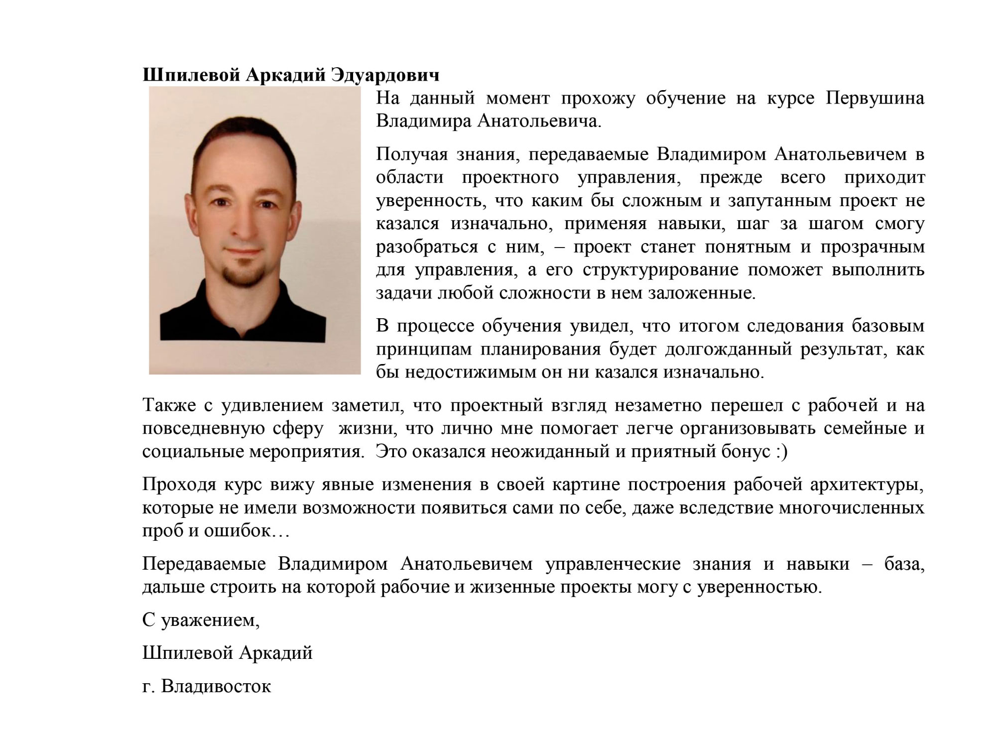 Добрый день, Владимир Анатольевич! Мы высоко ценим Ваше присутствие и переданные нам знания во время занятий! Особо хотелось подчеркнуть не стандартный подход по доведению материала до слушателей. Было крайне интересно и поучительно. Замечательно было наблюдать как Вы держали постоянно внимание всех учащихся в течении всего курса! Мы всегда рады Вас видеть у нас не только как учителя, но и как человека находящегося в отпуске или в турпоходе на Дальнем Востоке. Готовы встретить и оказать различную помощь в том числе транспортом.Соловьев Александр Авинирович, Первый заместитель директора Филиала «Аэронавигация Дальнего Востока»