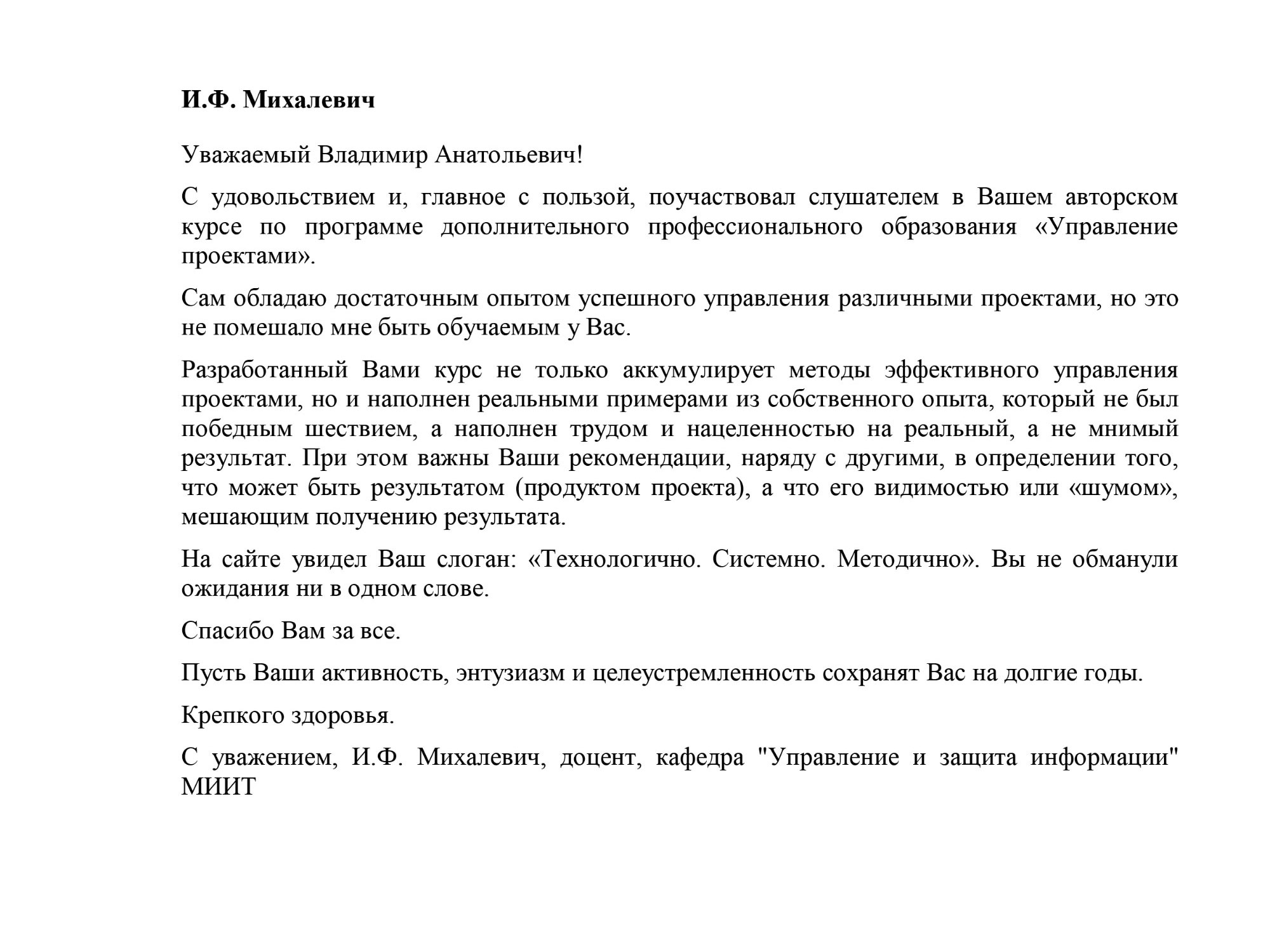 Всегда вспоминаю с благодарности Ваши урок в плане менеджмента для меня лично! По большому счёту я у Вас получал главные свои азы по управлению проектами.Михаил Корняков. Проректор ИрГТУ