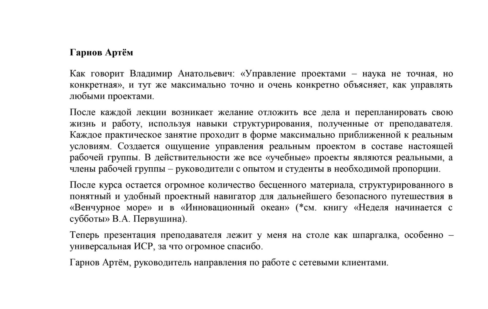 Уважаемый Владимир Анатольевич! Ваш курс по управлению проектами на ФИТБ до сих пор вспоминаю с благодарностью. А главное, Вы умели показать на своем примере, каким должен быть настоящий руководитель. Мы, Ваши бывшие студенты, это помним и искренне желаем Вам всего наилучшего в работе и в жизни!Ваш любимый ученик на нашем курсе, Саша Шарин (худенький очкастый парень, мы вместе работаем)): тоже часто Вас вспоминает. «А помнишь, как нам про это говорил Первушин…?». Вы для него – гуру по ведению проектов и Настоящий Мужик))Елена Мельникова